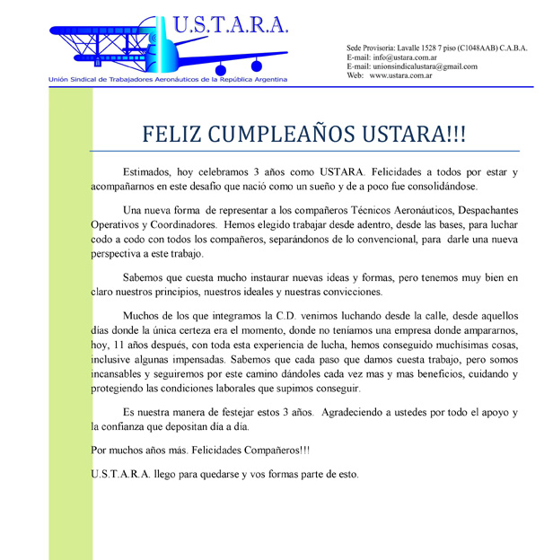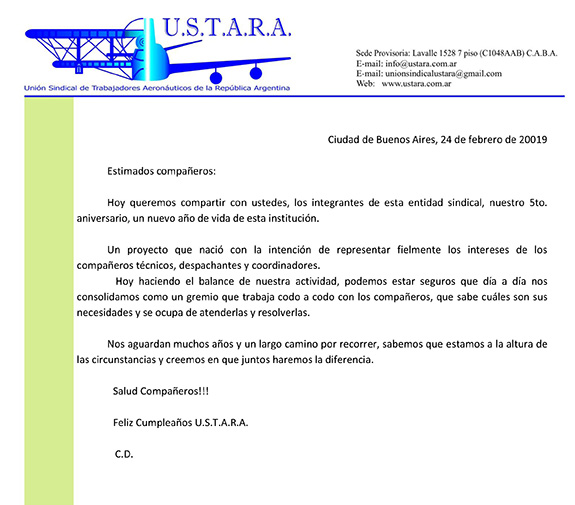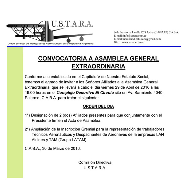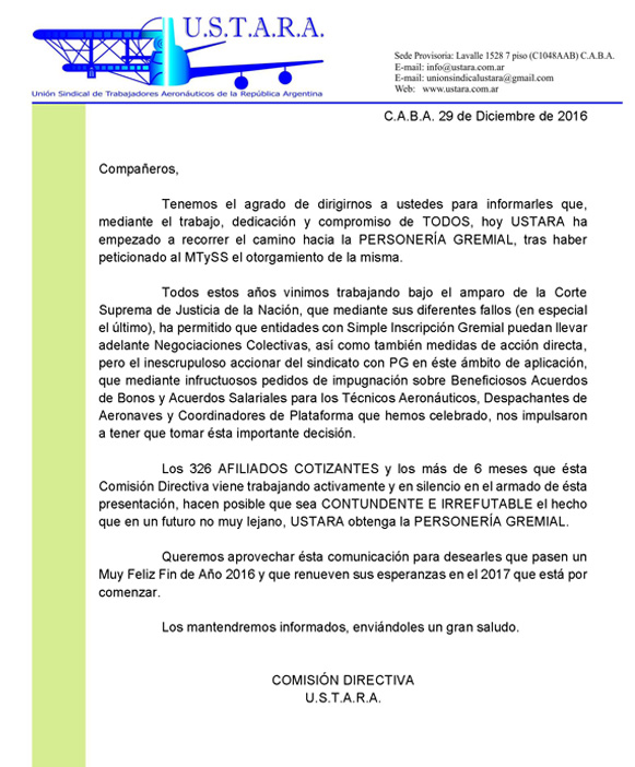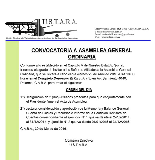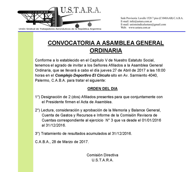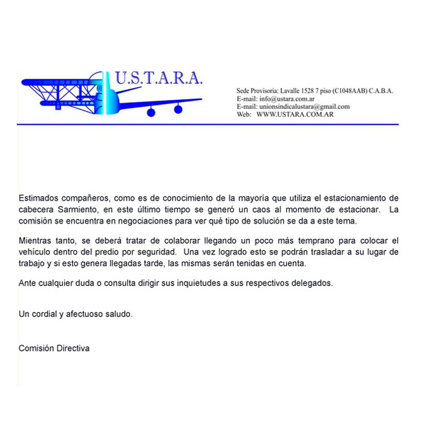 Para contactarse durante este periodo sigue disponible el mail secretaria@ustara.com.ar o comunicarse al whatsapp 54 911 6378 6876 o al 54 911 6199 0025 de nuestra Secretaria Luciana Rosellini que habitualmente atiende la oficina.